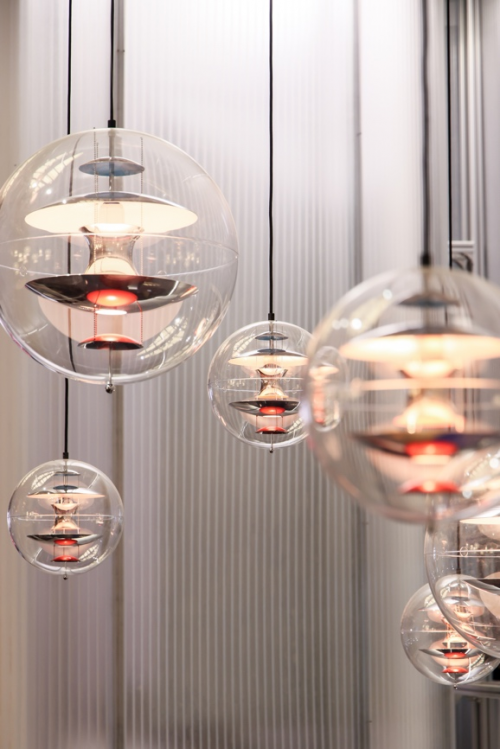 备受瞩目的 VP Globe吊灯则位于上方,一展其柔光色彩。VP Globe 的分层设计和亚克力球形灯罩,是 Panton 对工业材质的巧妙运用,塑料金属片的光泽与星体璀璨的视觉特点相联系,给人留下深刻的印象。此次也带来了全新尺寸的延伸系列,小巧精致。时至今日, Verpan也在持续为 VP Globe 尝试新的材质,从金属到玻璃,旨在为其延续设计吸引力。