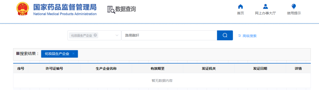 此外,青眼在国家药监局中以“路易酩轩”“路威酩轩香水化妆品(上海)有限公司”等为关键词检索,尚未发现相关化妆品生产企业许可证的信息。
