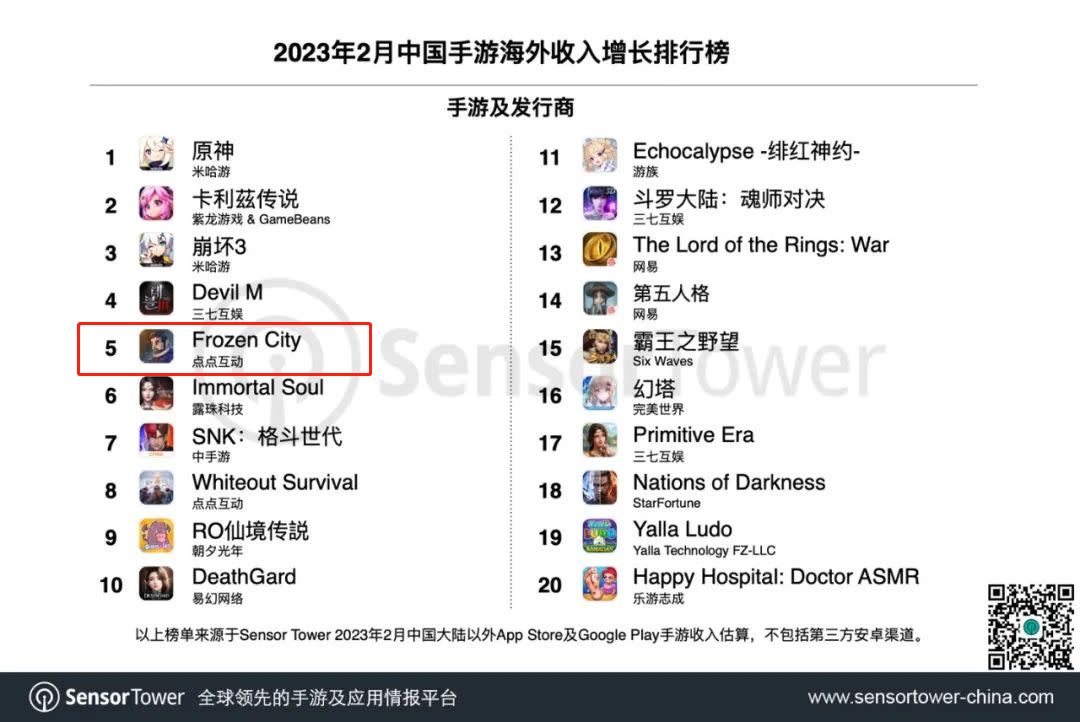 相较于国内市场的“摸索”,去年有点点互动凭借IP衍生游戏《Family Farm Adventure》(菲菲大冒险)在北美市场获得亮眼成绩,今年又有《Frozen City》(冰封时代)闯进2月海外收入增长榜前5。