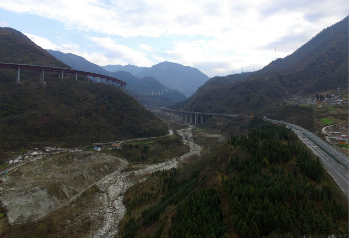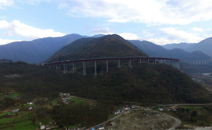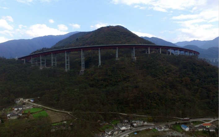 双螺旋隧道”干海子特大桥犹如一条盘旋山间的巨龙一般。