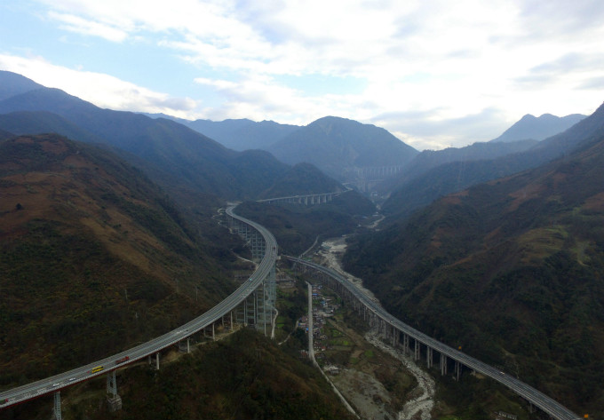 “双螺旋隧道”干海子特大桥位于海拔2500米的雅安石棉县境内,桥总长1811米,设计宽度24.5米,共36跨,最高桥墩高达110米。