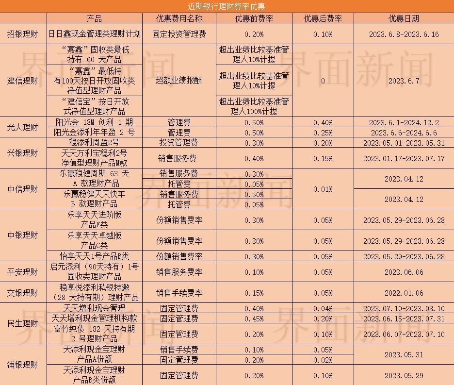 近日,界面新闻注意到,多家银行发布公告,下调理财产品费率。梳理发现,几乎每家银行理财子公司都有涉及,优惠的费率包括了管理费、托管费、销售服务费和超额业绩报酬。但从数量上而言,费率优惠产品占比并不高。