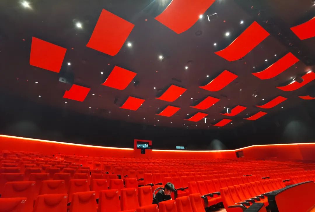 项目另一大亮点是位于二楼的“千人大厅”——如今,这里被命名为“上海杜比剧场”。在此次焕新升级中,杜比实验室为上海影城度身定制了亚洲首个拥有超千座的、能够提供杜比沉浸式视听体验的创新空间。而在这片红色海洋的顶端,36块造型别致的吸声板,都是现场制作并安装的。“由于场地条件限制,我们只能现场制作模具再下料安装。”鲜奉俊说。