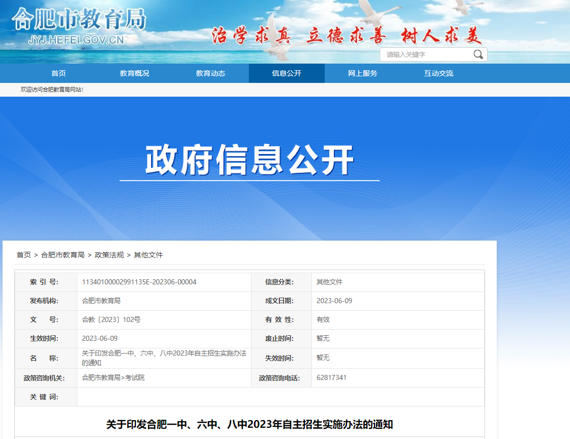 6月9日,合肥市教育局网站发布《关于印发合肥一中、六中、八中2023年自主招生实施办法的通知》。实施办法全文如下: