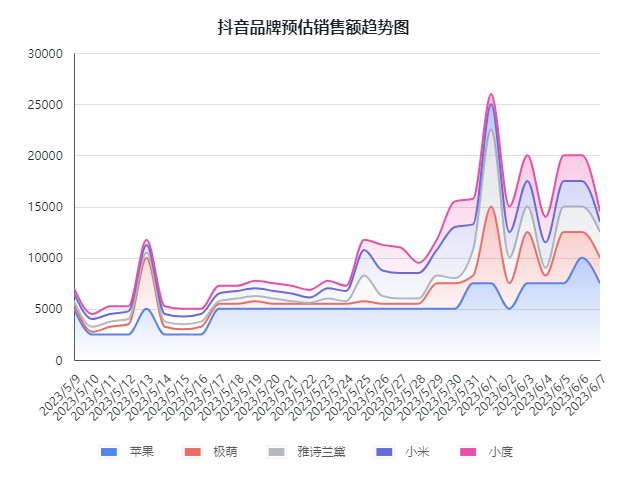 以下列举了数码品类高热品牌:苹果、小米、小度;美妆品牌:极萌、雅诗兰黛 在抖音平台预估销售额趋势。