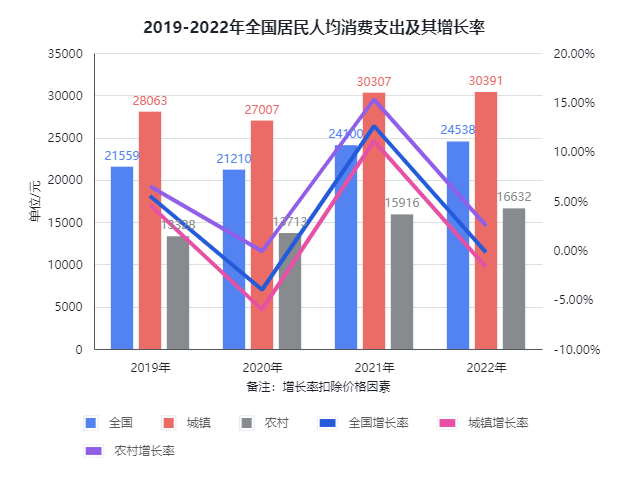 据国家统计局数据显示,2019年-2022年全国居民人均消费支出中农村地区消费支出逐年上涨,且增长率高于城镇居民消费支出增长率。