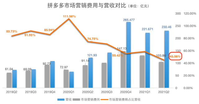 从财报数据可以看出,拼多多在2019年发起百亿补贴之后,市场营销费用在一年内快速上升,之后则持续下降。