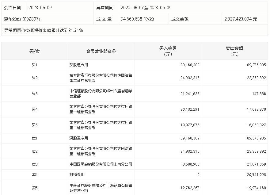 6月9日,意华股份今日涨停,龙虎榜数据显示,6月7日至6月9日期间,上榜营业部席位合计成交4.07亿元,其中买入金额为1.97亿元,卖出金额为2.1亿元,合计净卖出1273.17万元。