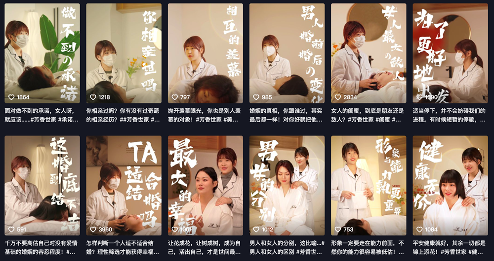 情绪价值,是需要真实的人物来提供的。芳香世家女性向视频内容的来源就是店内美容师的所见所闻,通过短视频传播吸引了大量从没有体验过美业的人群。