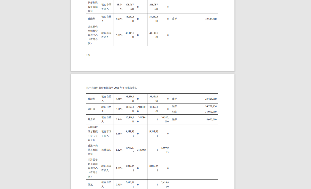 拉卡拉2021年年报显示,联想控股持有2.26亿股,持股比例28.24%;孙陶然持股5525.28万股,持股比例6.91%;孙浩然持股3883.68万股,持股比例4.85%。
