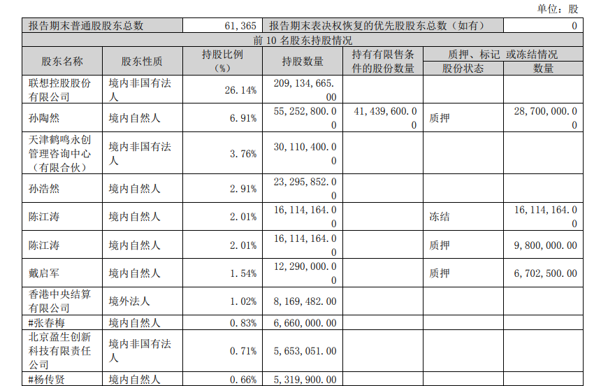 截至2023年一季度末,联想控股持有拉卡拉2.09亿股,持股比例26.14%;孙浩然持有拉卡拉2329.59万股,占比2.91%。