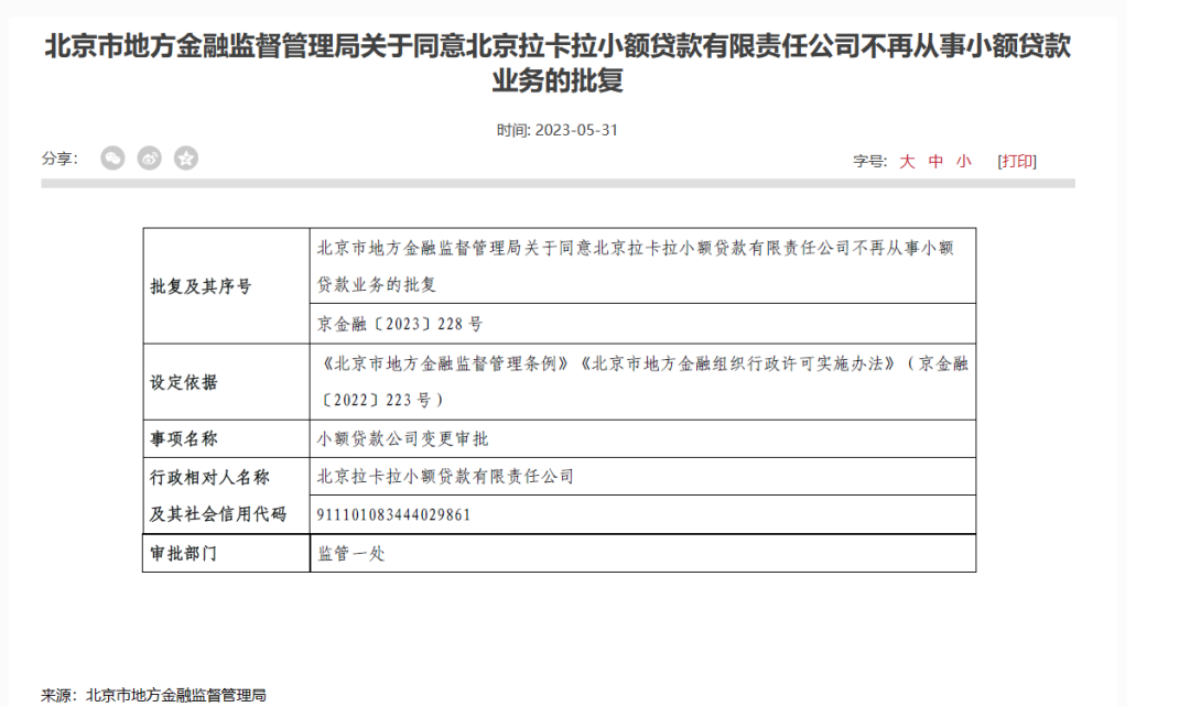5月31日,北京地方金融监督管理局发布了《关于同意北京拉卡拉小额贷款有限责任公司不再从事小额贷款业务的批复》。
