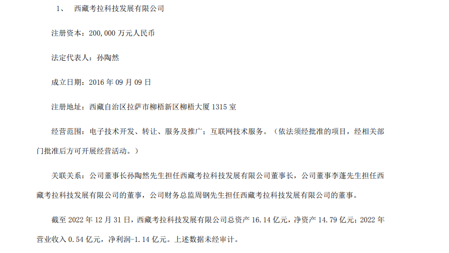 公开资料显示,西藏考拉科技成立于2016 年9月9日,注册资本200,000万元人民币。公司经营范围包括电子技术开发、转让、服务及推广;互联网技术服务。