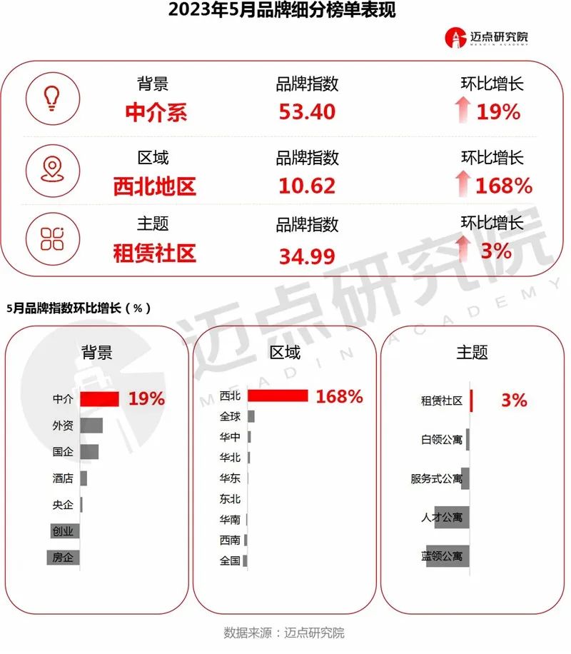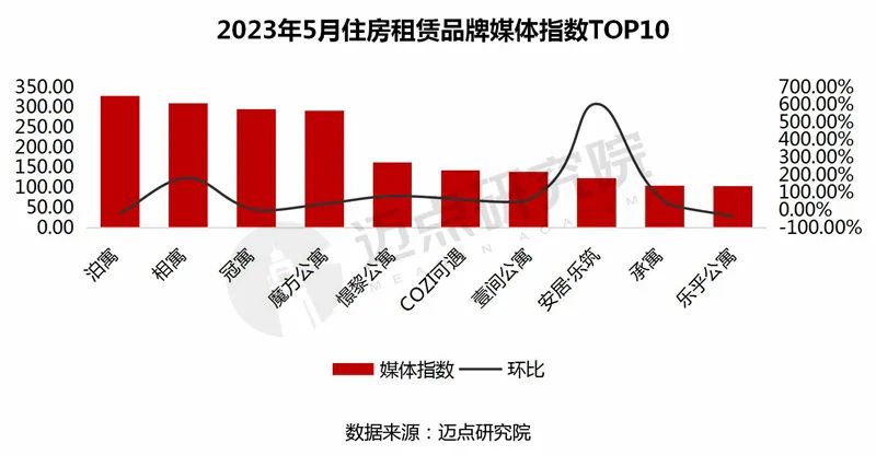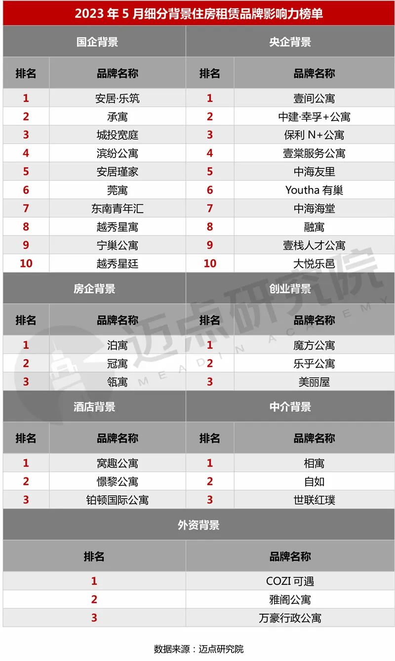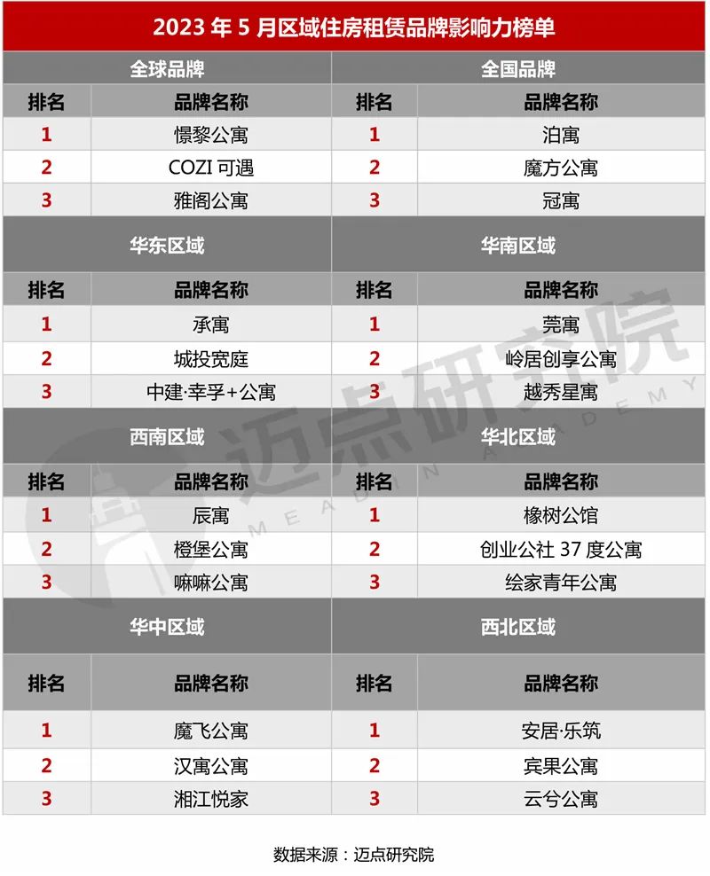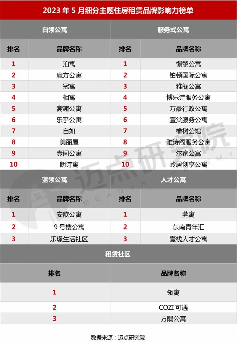 “2023年5月住房租赁品牌指数(MBI)影响力”数据来源于迈点品牌指数MBI,根据迈点品牌指数MBI近417家品牌数据汇总统计而成。具体说明:
