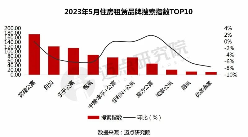 本月搜索指数排名前十的品牌依次是:窝趣公寓、自如、乐乎公寓、瓴寓、中建·幸孚+公寓、保利N+公寓、魔方公寓、城家公寓、融寓、优客逸家。其中,值得重点关注的是魔方公寓,本月搜索指数达到48.70,前十品牌中搜索指数涨幅最大。
