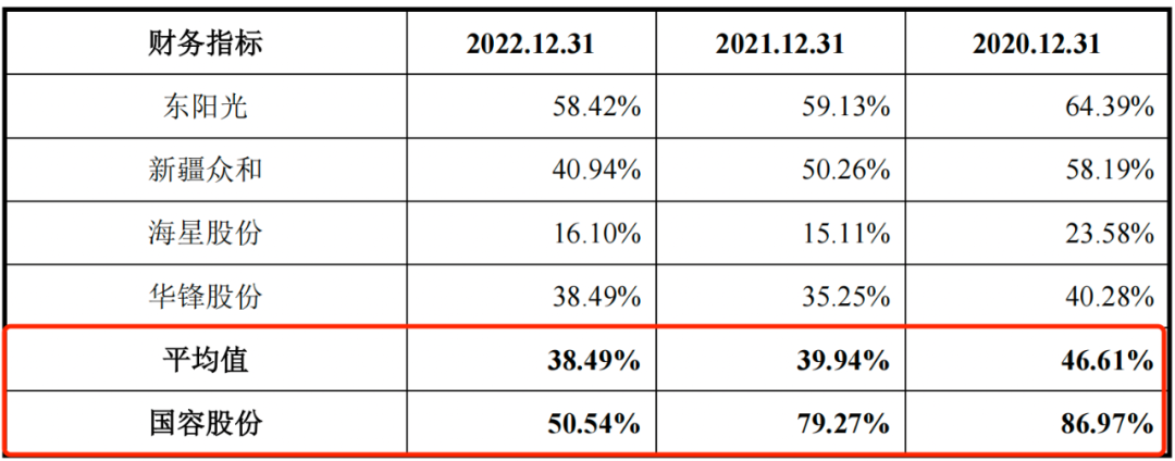 招股书显示,2020年-2022年(以下简称“报告期”),国容股份资产负债率分别为86.97%、79.27%和50.54%,同行业可比上市公司的资产负债率平均值分别为46.61%、39.94%和38.49%。