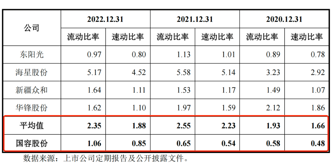 报告期内,国容股份的流动比率(流动资产对流动负债的比率)分别为0.58、0.65和1.06,同期同行业可比公司的流动比率均值分别为1.93、2.55和2.35;国容股份的速动比率(流动资产减去存货和预付费用后的余额对流动负债的比率)分别为0.48、0.54和0.85,同行业可比公司的速动比率均值分别为1.66、2.23和1.88。