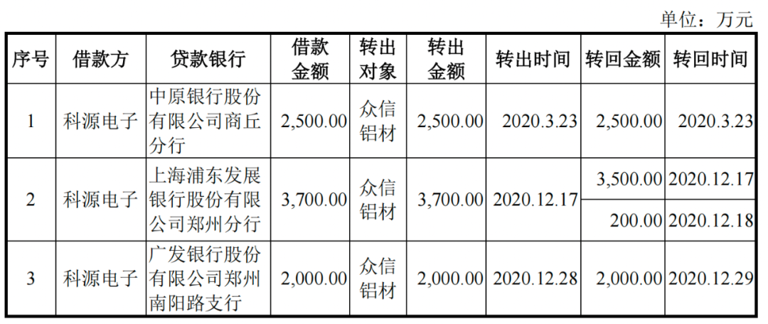 对此,国容股份在招股书中表示,为满足贷款银行受托支付的要求,科源电子在取得银行贷款后,以支付原材料采购款的名义将资金划给永城众信铝材有限公司(以下简称“众信铝材”),再由众信铝材转回至科源电子。