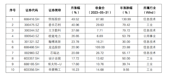安徽辖区涨幅排名前10位的股票中,信息技术占据5席,工业占据4席,公用事业占据1席。