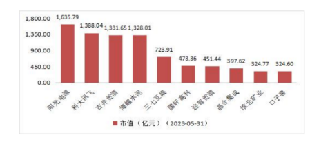 截至2023年5月31日,安徽辖区A股上市公司的总市值为20,053.86亿元,占A股上市公司总市值的2.16%。市值排名前十的公司如下,阳光电源、科大讯飞、古井贡酒市值位居前三。