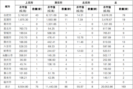 截至5月底,安徽区域共有A股上市公司169家,位居全国第9位。