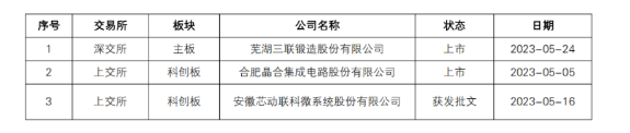 据统计,5月安徽辖区内上市2项,获批发文1项,其中芜湖三联锻造股份有限公司和合肥晶合集成电路股份有限公司已上市,安徽芯动联科微系统股份有限公司获批发文。