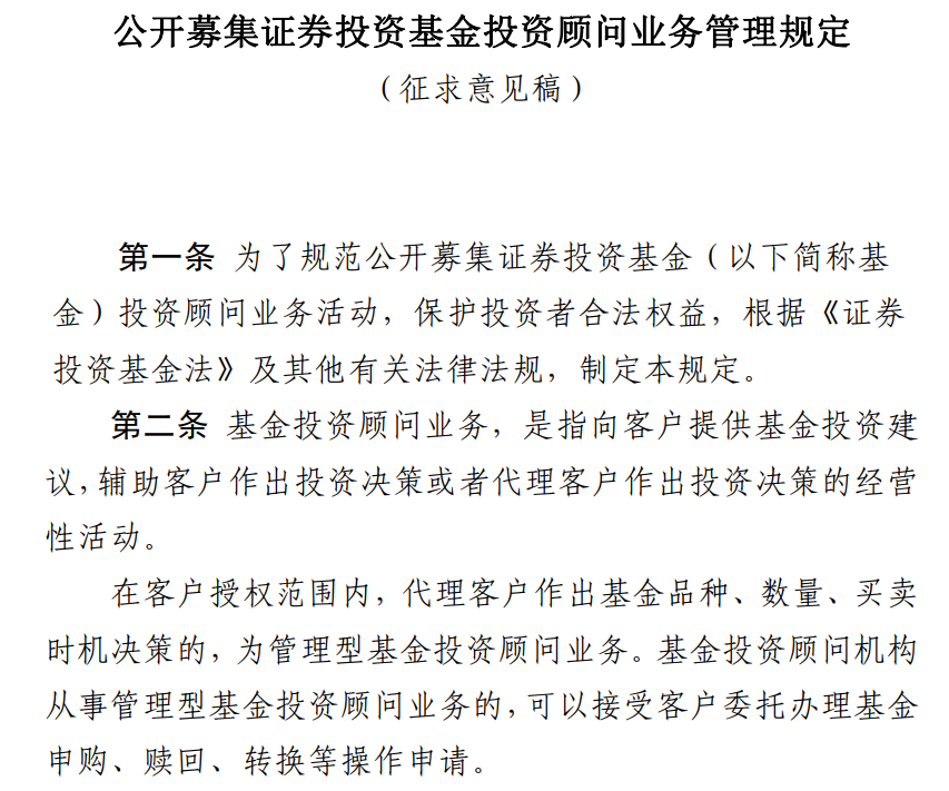 今日,证监会起草《公开募集证券投资基金投资顾问业务管理规定》(以下简称《规定》),并向社会公开征求意见。此举为健全资本市场财富管理功能,深化资本市场投资端改革,发展买方中介队伍,推动基金投资顾问业务试点转常规。