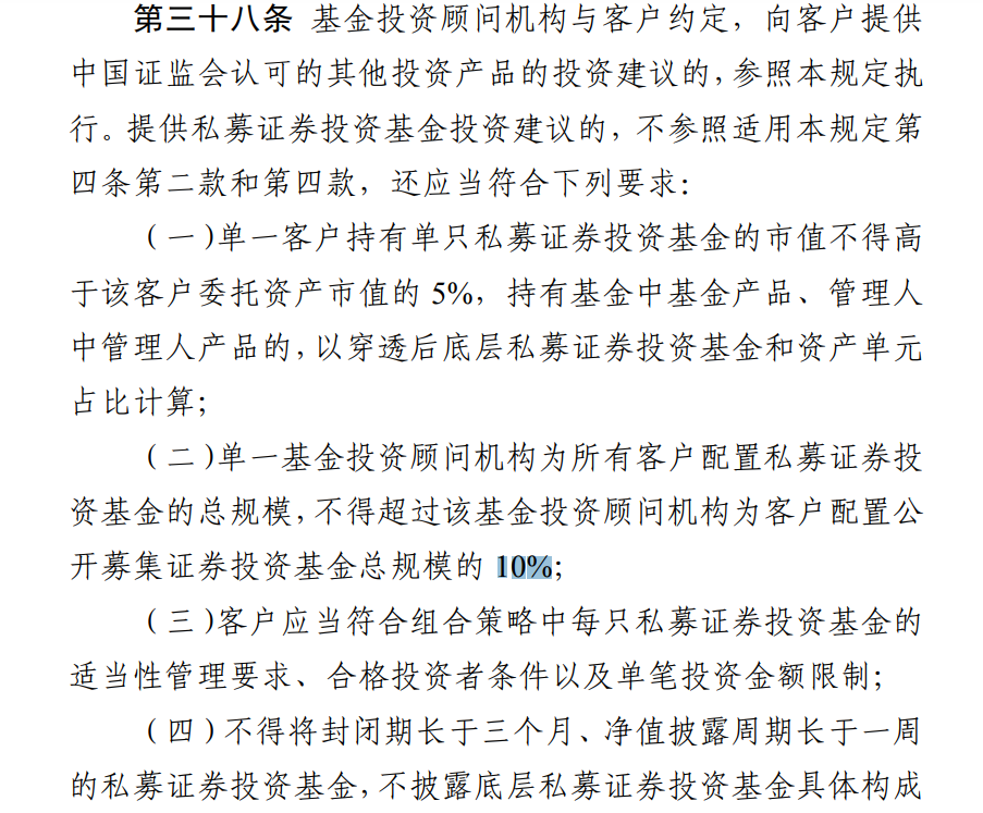 当基金投顾为投资者提供私募的投资建议时,还应当符合下列要求:(一)单一客户持有单只私募的市值不得高于该客户委托资产市值的 5%,持有FOF、MOM的,以穿透后底层私募和资产单元占比计算; (二)单一基金投资顾问机构为所有客户配置私募的总规模,不得超过该基金投资顾问机构为客户配置公募总规模的10%。