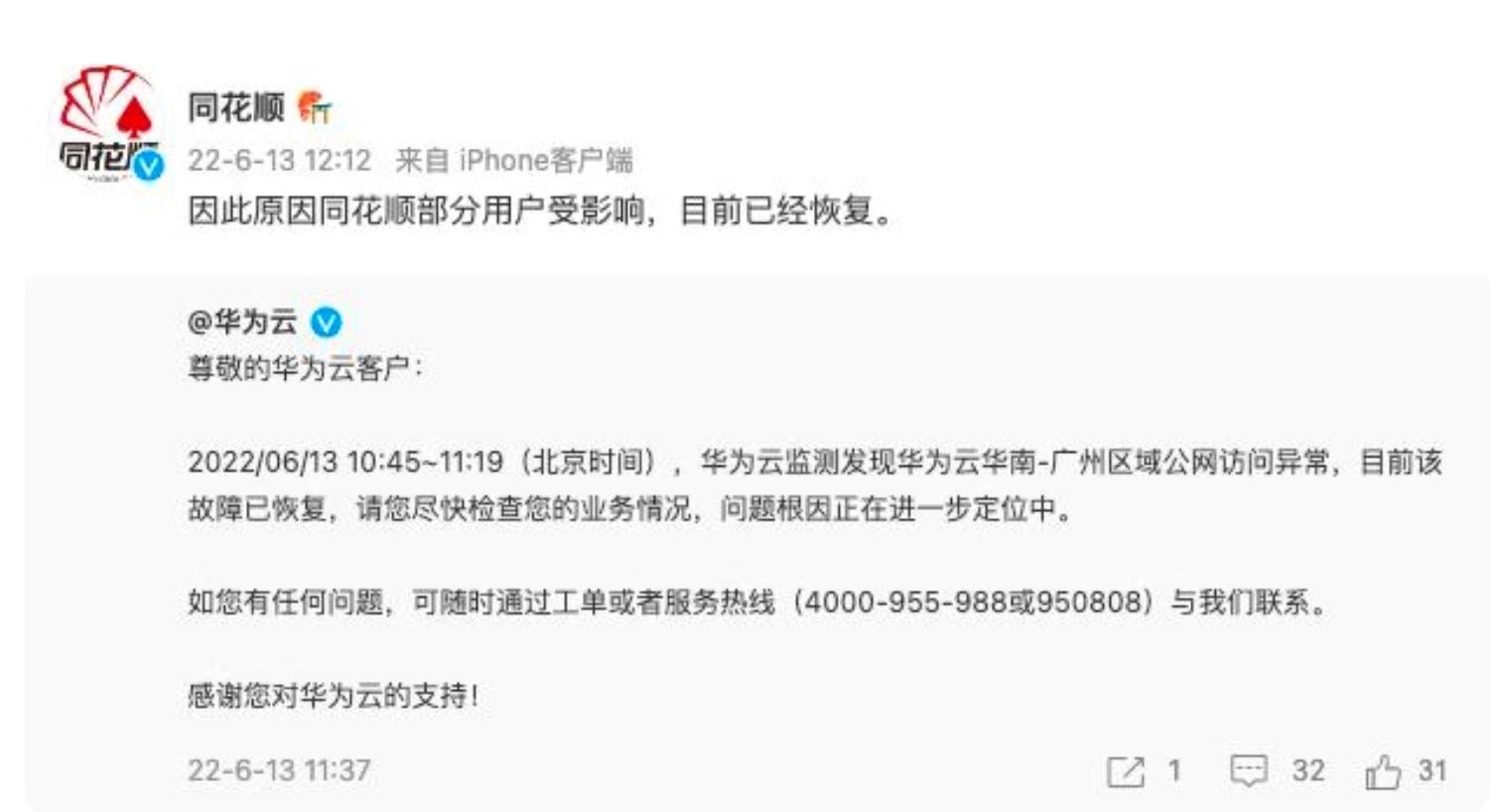 华为云的市场市场份额虽然从10.8% 增到12.1%,排名从第三升至第二,但是,其能否持续增长令人担忧,因为从增速上来讲,华为云其实并不如天翼云发展迅速,与此同时,经历过2022年6月份同花顺的事件之后,很多企业其实对于大规模使用华为云依旧存在疑虑——2022年6月13日,华为云崩了、同花顺APP崩了一度成为微博热搜,对此,同花顺表示,“华为云部分区域网络出问题,我们部分用户也因此受到影响。”