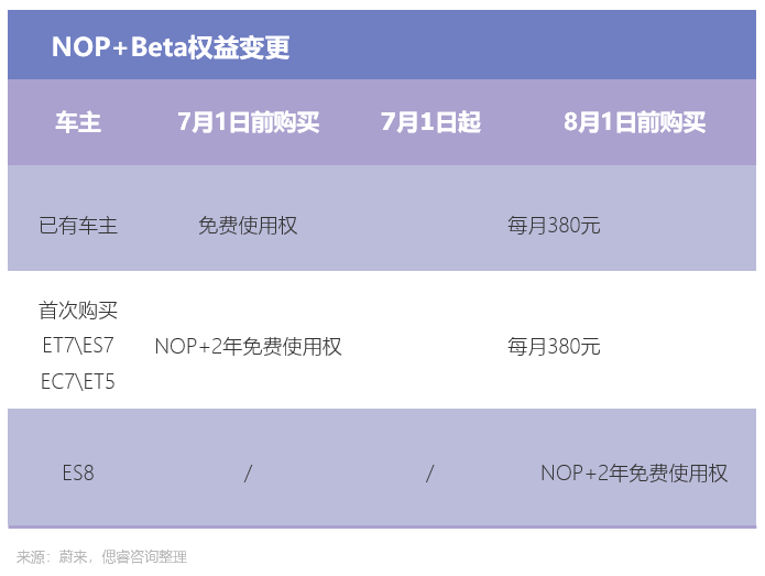 在公布购车权益调整的同时,蔚来还宣布驾驶NOP+ Beta免费试用将于今年六月底结束,七月起NOP+将升级为正式版并开启按月订阅的模式,但在规定时间内支付的ET7、ES7、EC7、ET5,以及ES8首任车主车主,蔚来皆给予NOP+Beta2年免费使用权。