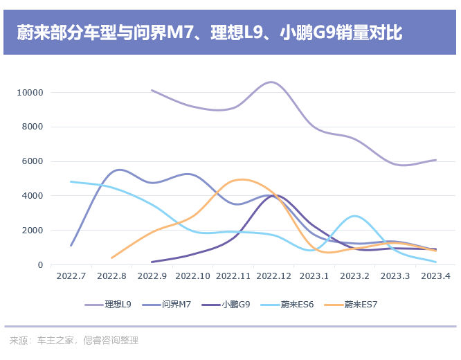 可以看的是,问界M7、理想L9相继出世之后,蔚来车型便失去了其优势地位,现阶段,渐有一蹶不振之势。