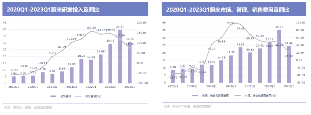 同时研发费用与市场、管理、销售费用投入力度减少,但仍处于高位:2023Q1蔚来研发费用 30.76 亿元,同比增长 74.6%;销售、管理及市场费用为 24.46 亿元;同比增长 21.4%。