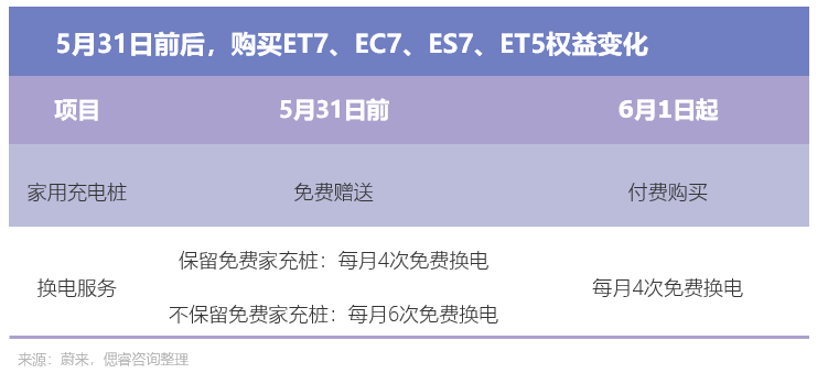 首先,是在充电服务上的变动。ET7、EC7、ES7、ET5首任车主在6月1日前购买,免费赠送家用充电桩,保留免费家充桩每月4次免费换电,而不保留免费家充桩每月6次免费换电。在6月1日之后购买,车主需付费购买家用充电桩,且都是每月4次免费换电。