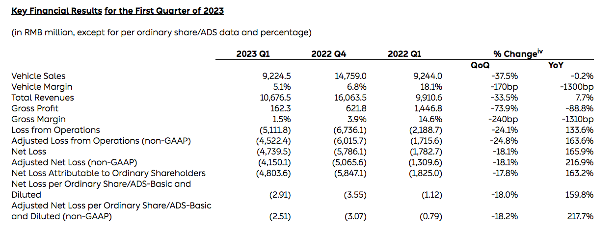 2023年第一季度,蔚来汽车的毛利率为1.5%,而2022年第一季度为14.6%,相较之下出现了大幅下降。
