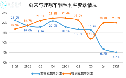2021年第一季度,蔚来毛利率为21.2%高于理想的16.9%。随后除了去年第三季度理想因为疫情和供应链原因毛利率跌至12%,被蔚来反超外,其余7个季度其单车毛利皆高于蔚来。