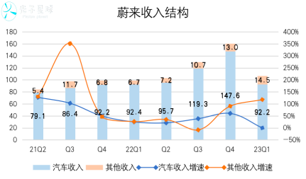 汽车销售收入之外,蔚来还有一部分非汽车销售的收入,主要包括智驾、补能服务、售后服务、车辆附件以及用户相关等业务所产生的收入。该部分一季度营收14.5亿元,同比增长117.8%,占总营收的13.6%,因汽车销售收入增长停止,占比相较之前有所提高。