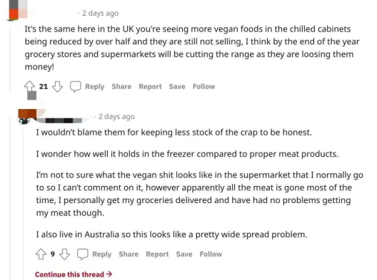 据新闻报道,在当地时间8日,国外知名论坛Reddit上有人分享了一个有意思的帖子,“暴风雪天气下,你会宁愿饿死也不吃人造肉。”而在相关话题下,不乏植物肉价格太贵、难吃和食品添加剂过度等吐槽。
