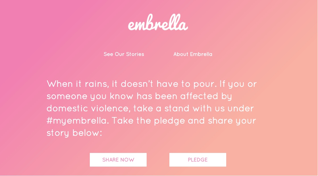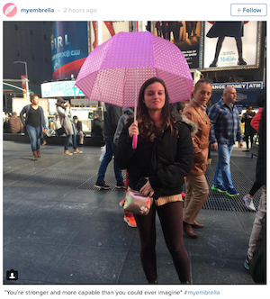 在11月10日这天,他们则在纽约时代广场用一把代表庇护的粉色伞宣传Embrella,吸引人们对于家暴问题的关注。“即使大雨倾盆,你也不一定要被淋湿”,xAd的慈善大使Julie说,“我们希望这把粉色伞能够帮助困难中的人到达更好的地方。”