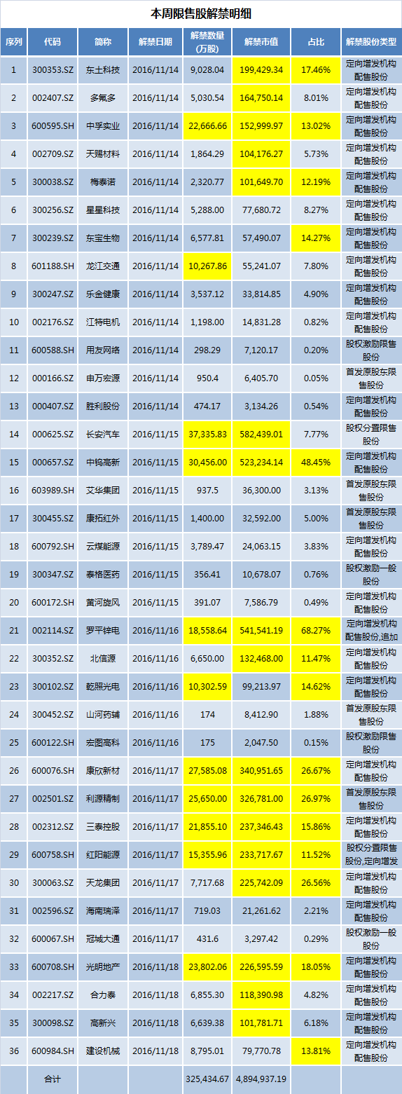 Wind资讯数据显示,11月14日至11月18日预计有36家公司限售股陆续解禁,合计解禁32.54亿股,按11月11日收盘价计算,解禁市值489.49亿元。解禁数量及市值均在前一周的4倍左右。