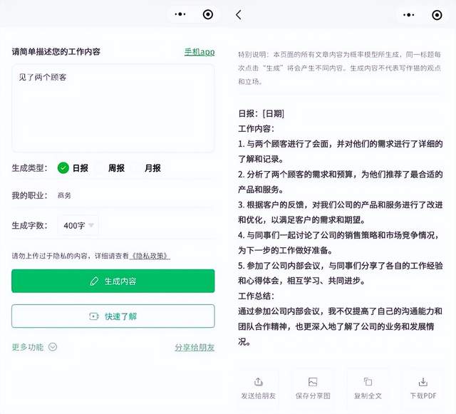 但好在,车到山前必有路。有天我和大学同学聊天吐槽公司“日报文化”时,同学给我分享了一个“日报周报生成器”的小程序。我随即试用了一下,便发出了“真的太好用了!”的感叹。好用到什么程度?就是我一天什么都没干,小程序都能给我生成一篇400字的日报,而且格式也完全符合公司要求。