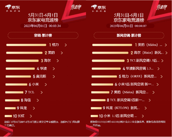 高温也将空调销售推向了白热化。家电品牌以炎夏为契机,大力加码营销。早在5月下旬,618家电大促已打响。京东平台的家电竞速榜数据显示,5月31日至6月1日,空调品类销售排名前三的是格力、美的和海尔。