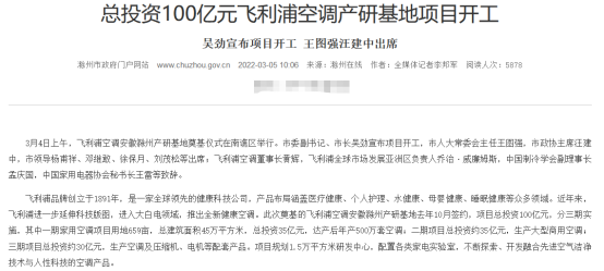 飞利浦空调百亿投资,来源:滁州市政府官网