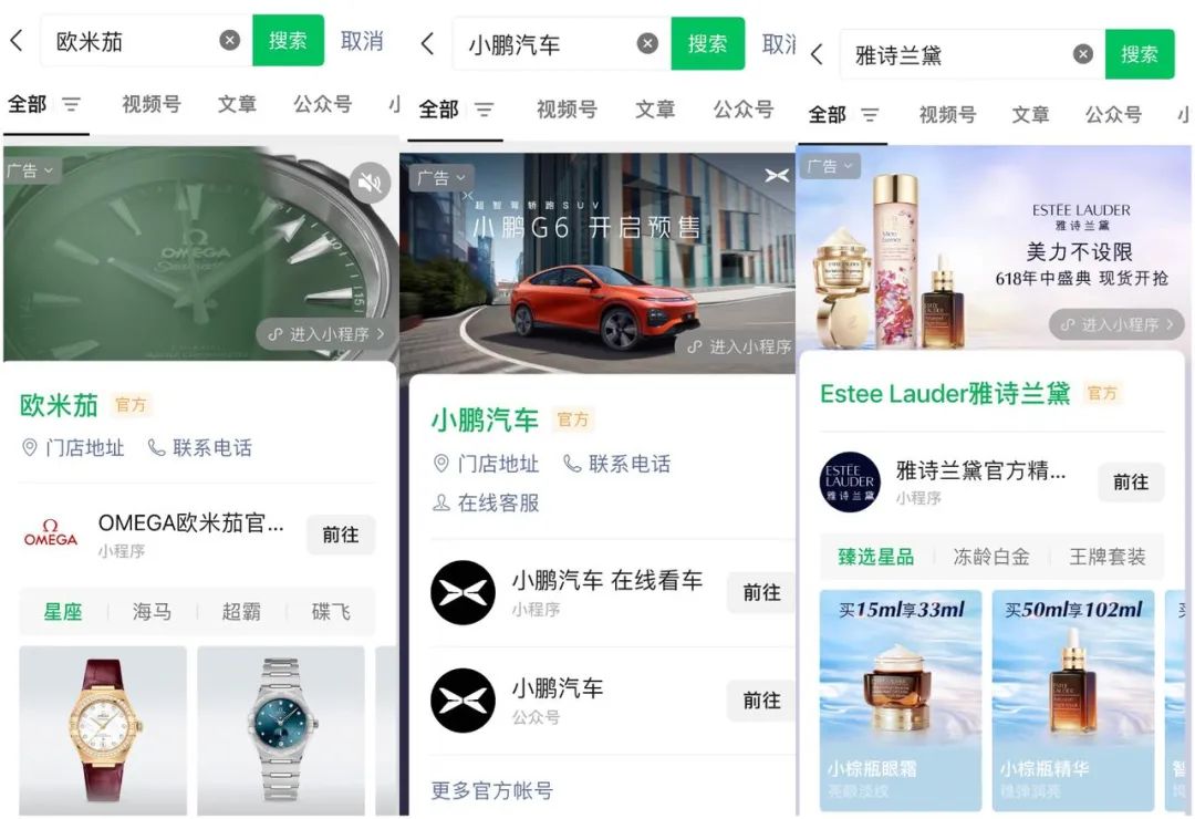 比如,一家汽车品牌投了微信搜索广告,获取销售线索的成本只有其他平台的75%;一家本土美妆品牌,整合微信搜索广告后,来自搜索的小程序PV环比增长127%;微信搜索对奢侈品行业的小程序GMV贡献率达到20%。
