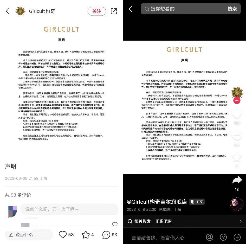 6月8日晚,Girlcult公开发布声明称:“近期Girlcult直播间的言论不当、处理不当,我们再次郑重对@吧啦吧啦及受到影响的消费者道歉。”