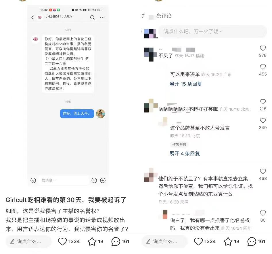 在直播间提问主播“不要白嫖试色”的言论后被踢出拉黑,如今,小红书用户“吧啦吧啦”历经一个月的拉锯战,终于等到了Girlcult品牌的公开回应。