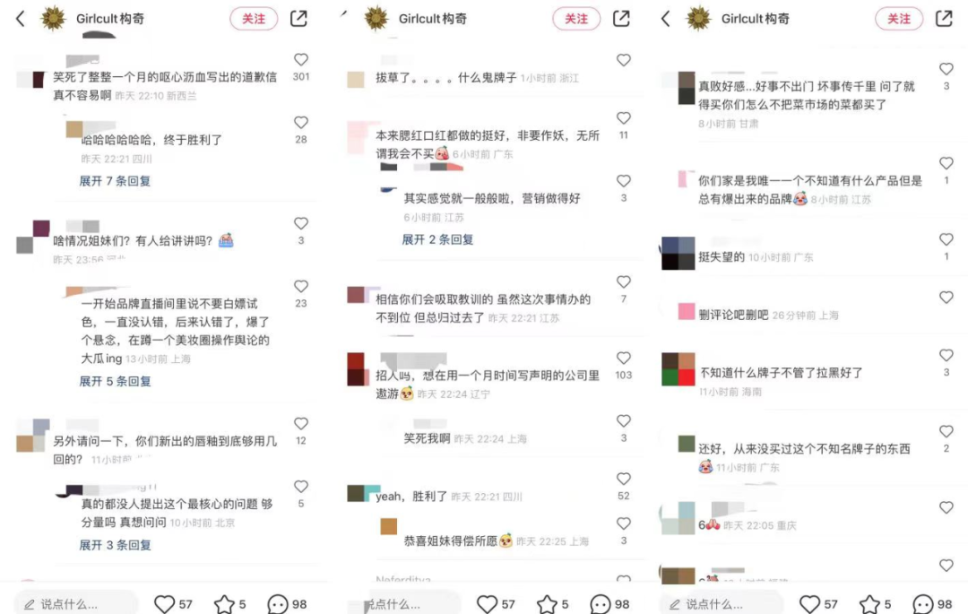 不过,Girlcult社媒平台的评论区显示,多名网友对此次发表的声明并不“买账”。“一个月才出道歉信”、“品牌拔草了”、“拉黑了”等评论也能看出,大部分网友的“怨气”似乎并未马上消失。