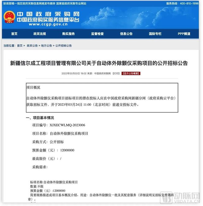 如新疆卫健委预算1200万的自动体外除颤器采购项目;成都市双流区卫生健康局发布了《2023年度公共场所配置自动体外除颤器(AED)采购项目公开招标采购公告》,预算490万采购200台AED;《汾阳市卫生健康和体育局采购公共场所急救设备自动体外除颤器设备项目的采购公告》,预算812.5万采购325台AED;而杭州市西湖区卫生健康局采购AED的预算更是高达1600万。