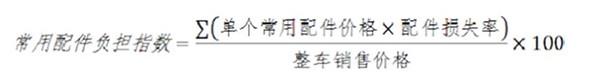 常用配件负担指数就是18 项单个常用配件价格乘上配件自身损失率的之和,再除以整车销售价格的比值,配件损失率则是根据事故车维修中单个配件损失金额与所有配件损失金额比值的统计。