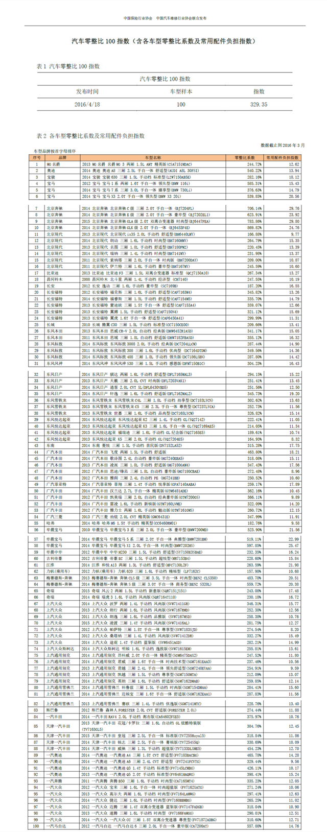 好了,看到这里,不少车主要说了,你光说公式有什么用,我们又查不到这些数据,而且这两个系数指标不少人都知道,有本事拿数据和我们说话。小王在这里也就一咬牙把完整的《2016年汽车零整比100指数》拿出来给大家风险了!