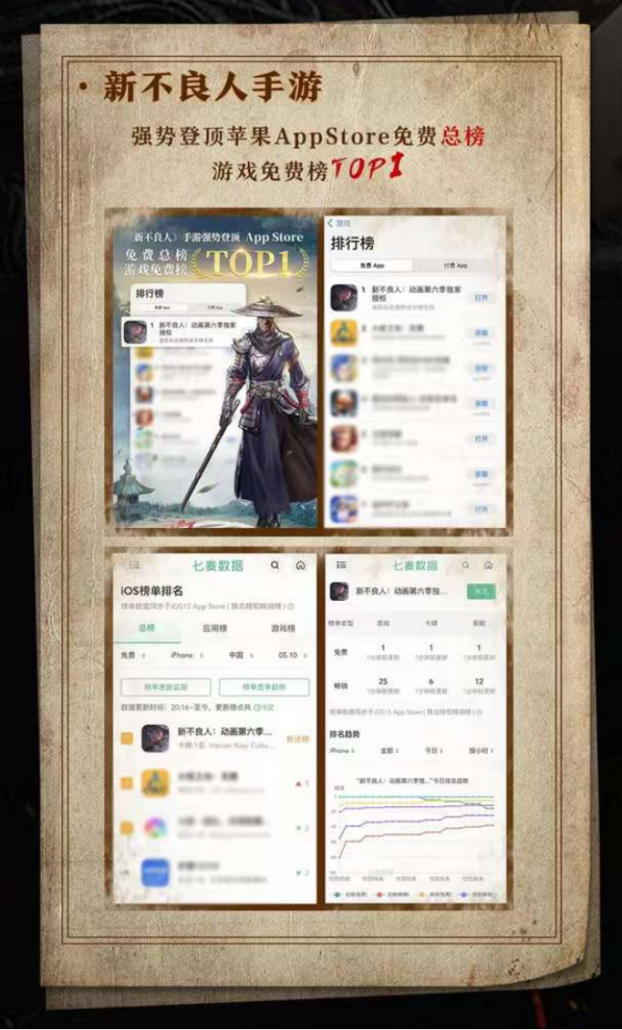 5月11日的《不良人6》完结直播,是若森首次尝试利用短视频平台直播推广长视频IP的形式。除了前文提到的成绩之外,这次直播最为成功的一点莫过于带动了《不良人》IP相关手游的数据。直播当天,《新不良人手游》直接登上App Store免费榜第一的位置。抖音游戏热榜的第一位也被《画江湖之不良人》所占据。